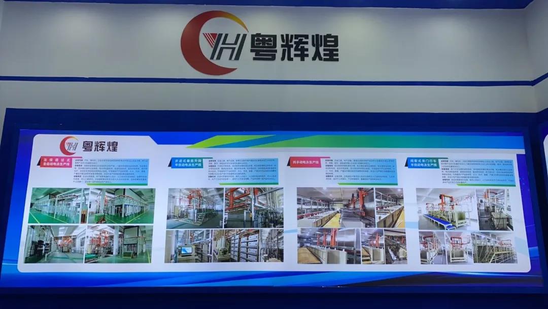 本次展会,粤辉煌展出了:连续通过式全自动电泳生产线,步进式垂直升降半自动,纯手动电泳生产线和间歇式龙门行车半自动电泳生产线。